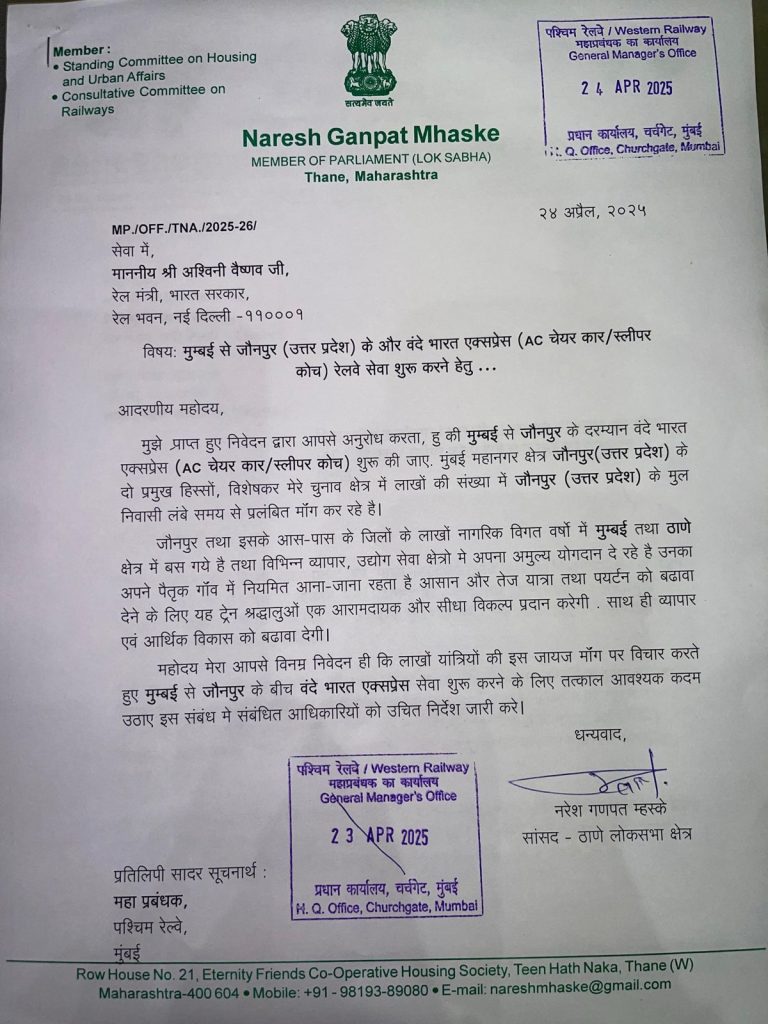 मुंबई। मुंबई और आसपास के शहरों में बड़ी संख्या में जौनपुर के लोग रहते हैं। पर्याप्त रेल सुविधा नहीं होने के कारण वहां के लोगों को अनेक प्रकार की कठिनाइयों का सामना करना पड़ता है। जौनपुर के लोगों की लंबित मांग को देखते हुए शिवसेना, मीरा भायंदर विधानसभा प्रमुख विक्रम प्रताप सिंह ने आज शिवसेना सांसद नरेश मस्के के साथ पश्चिम रेलवे के महाप्रबंधक अरविंद मिश्रा को रेल मंत्री अश्विनी वैष्णव के नाम ज्ञापन देकर वंदे भारत ट्रेन चलाने की मांग की। साथ ही उन्होंने राजस्थान जाने वाली ट्रेनों को भायंदर स्टेशन पर ठहराव करने की भी मांग की। पश्चिम रेलवे के महाप्रबंधक के साथ की गई बैठक में उन्होंने मीरा रोड स्टेशन तथा भायंदर स्टेशन पर यात्रियों को हो रही सुविधाओं की भी चर्चा की।